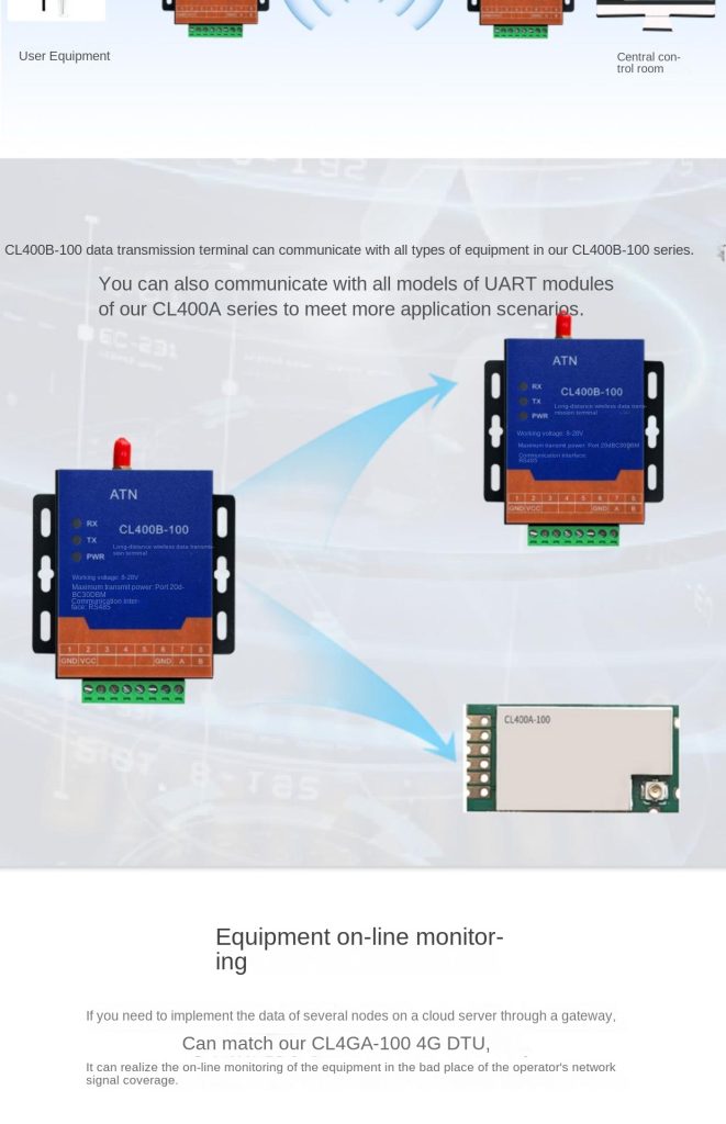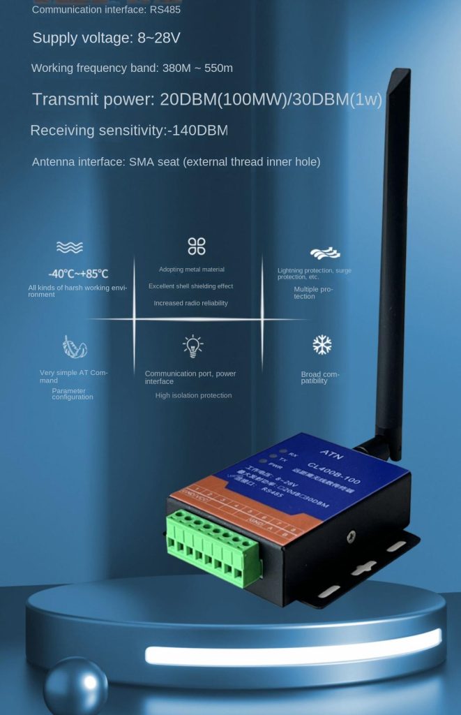 The CL400B-100 is a high-performance, pure radio device developed by OTOMO, utilising a fully domestic chip. Designed for robust wireless communication, it operates in the 380–550 MHz frequency band with 433 MHz as the default RF frequency.