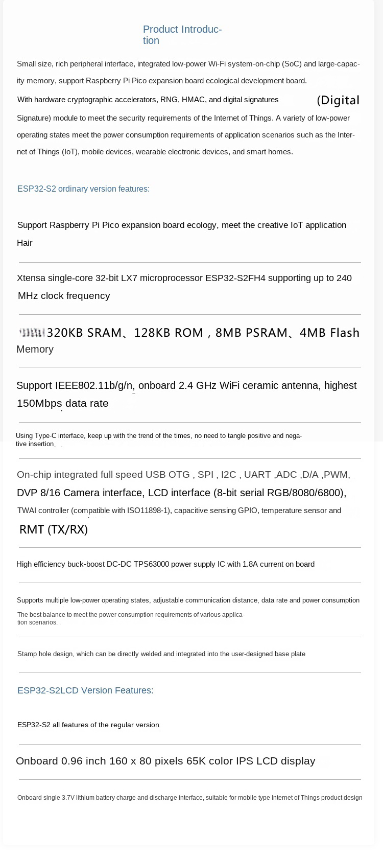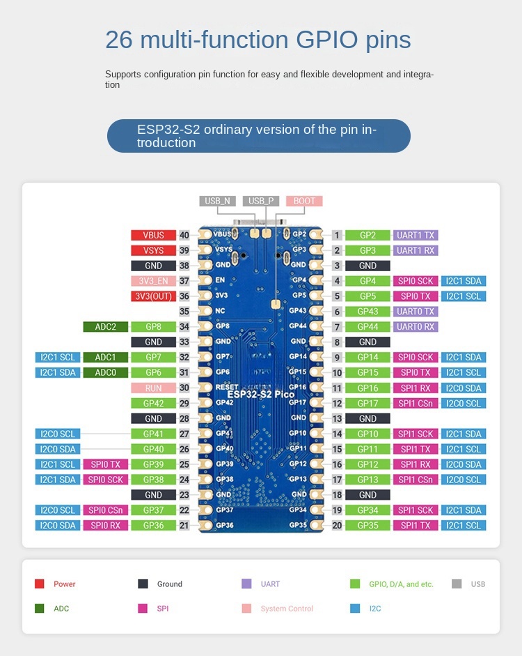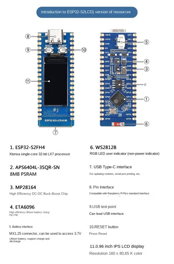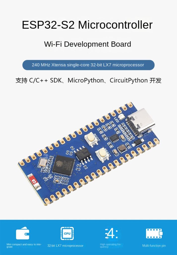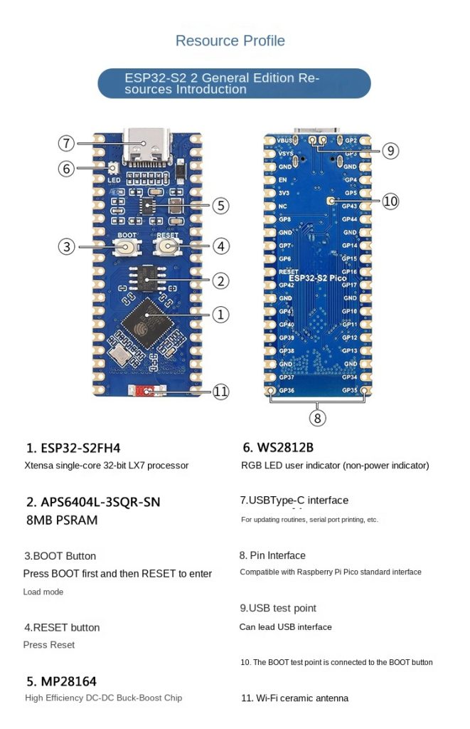| Product Features | Supports Raspberry Pi Pico expansion board ecosystem to meet creative loT applicationdevelopmentXtensa single-core 32-bit LX7 microprocessor ESP32-S2FH4 supports up to 240MHz clock frequency320KB SRAM,128KB ROM,8MB PSRAM, 4MB FlashMemorySupports lEEE802.11b/g/n, onboard 2.4GHz WiFi ceramic antenna, up to 150Mbps data rateIt uses a Type-C interface and keeps up with the trends of the times; there is no need to worry aboutthe forward and reverse plug.On-chip integrated full-speed USB OTG, SPI, I2C, UART, ADC, D/A, PWM, DVP 8/16 Camera interface.LCD interface (8-bit serial RGB/8080/6800),TWl controller (compatible with 1s011898-1), capacitive sensing GPlO,temperature sensor and RMT (TX/RX) Onboard 1.8A current high-efficiency buck-boost DC-DC TPS63000 power ICIt supports multiple low-power working states, can adjust the best communication distance, datarate, and power consumption balance, and meets various application scenarios’ power consumptionrequirements.Stamp hole design can be directly welded and integrated into the user-designed baseboard |