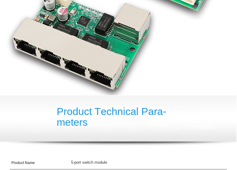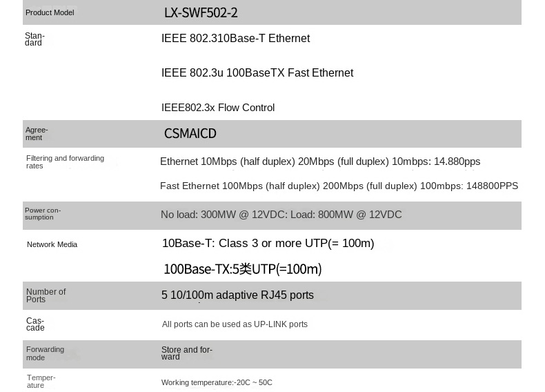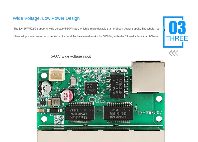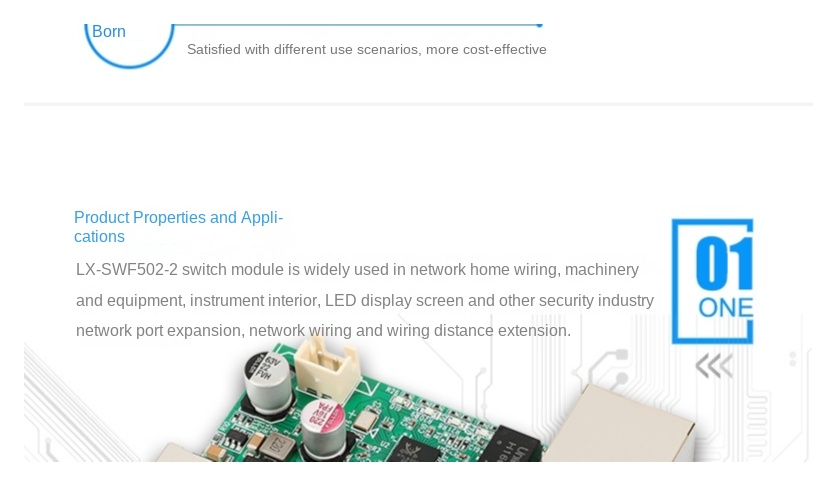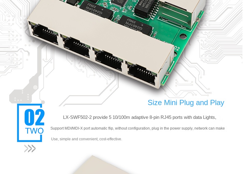 The LX-SWF502-2 is a compact 5-port 10/100Mbps Ethernet switch module designed for network expansion in home wiring systems, embedded devices, LED displays, and security applications. It supports IEEE 802.3 standards and features plug-and-play functionality with auto MDI/MDI-X support—no configuration required. All five RJ45 ports are adaptive and can serve as UP-LINK ports, operating in store-and-forward mode for efficient data transmission.