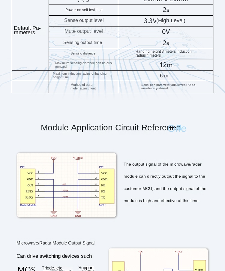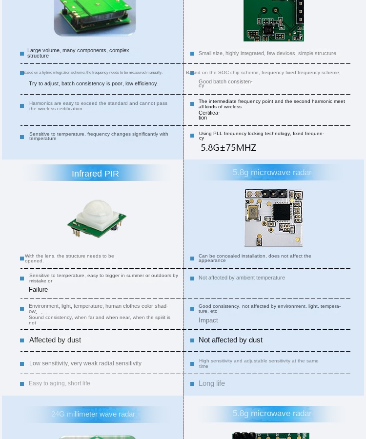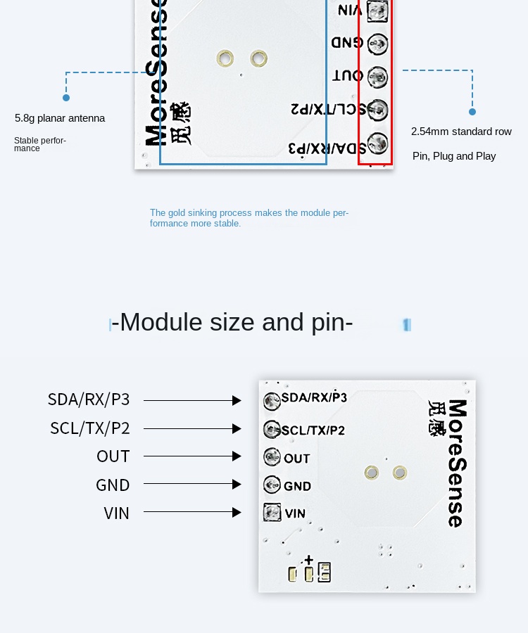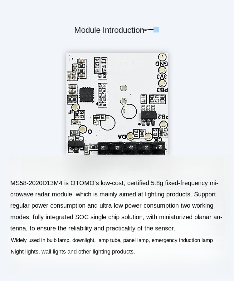 The MS58-2020D13M4 is a cost-effective 5.8 GHz microwave radar module designed specifically for lighting applications. It features fixed-frequency operation, is fully certified, and supports dual working modes—standard and ultra-low power—for flexible integration.