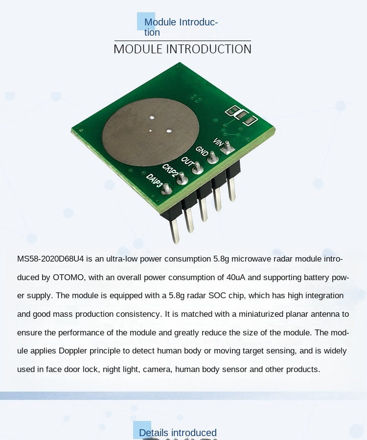 The MS58-2020D68U4 is a compact 5.8 GHz microwave radar module designed for ultra-low-power motion sensing applications. Ideal for battery-powered devices, it delivers stable performance in a highly integrated form.