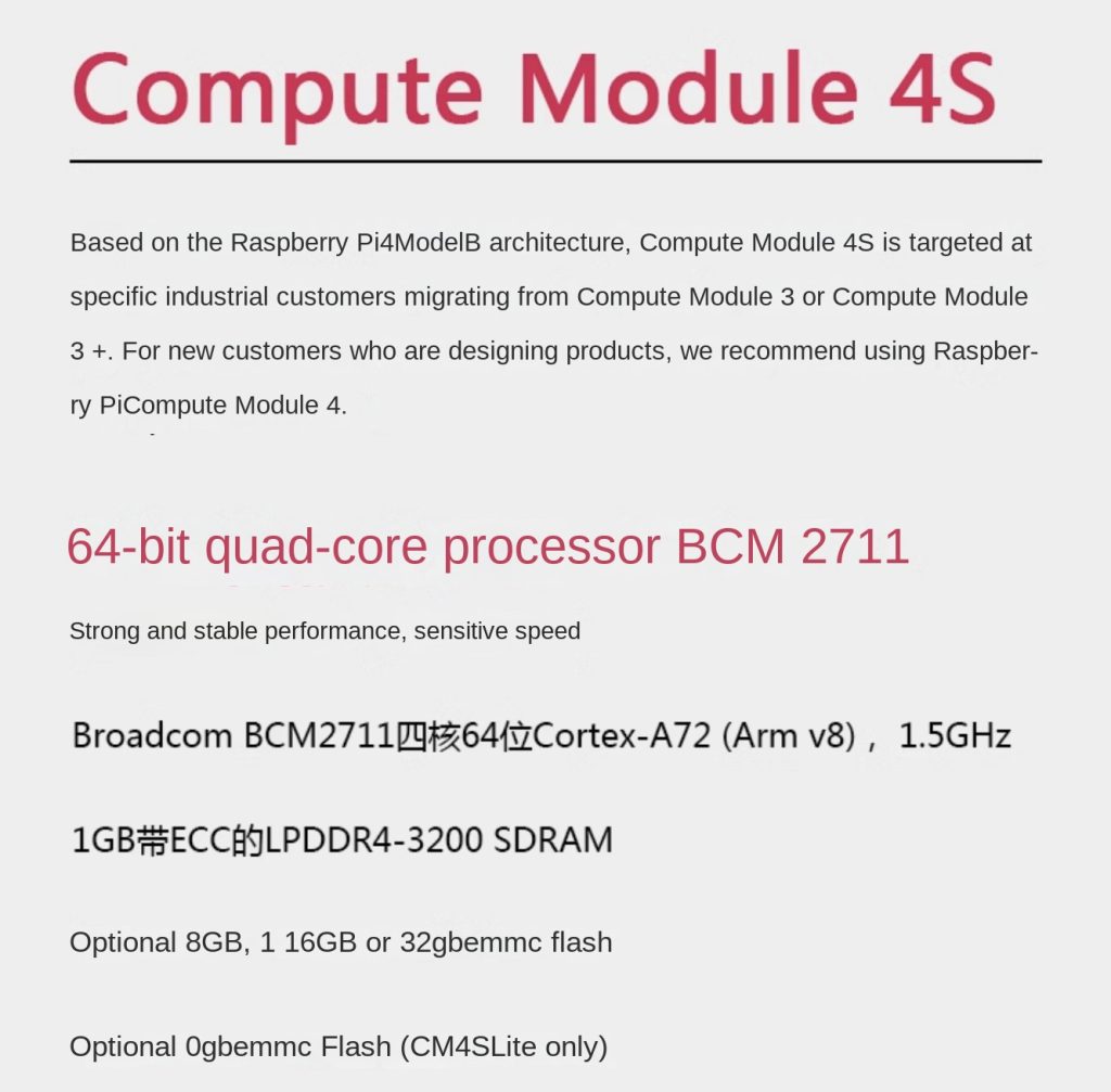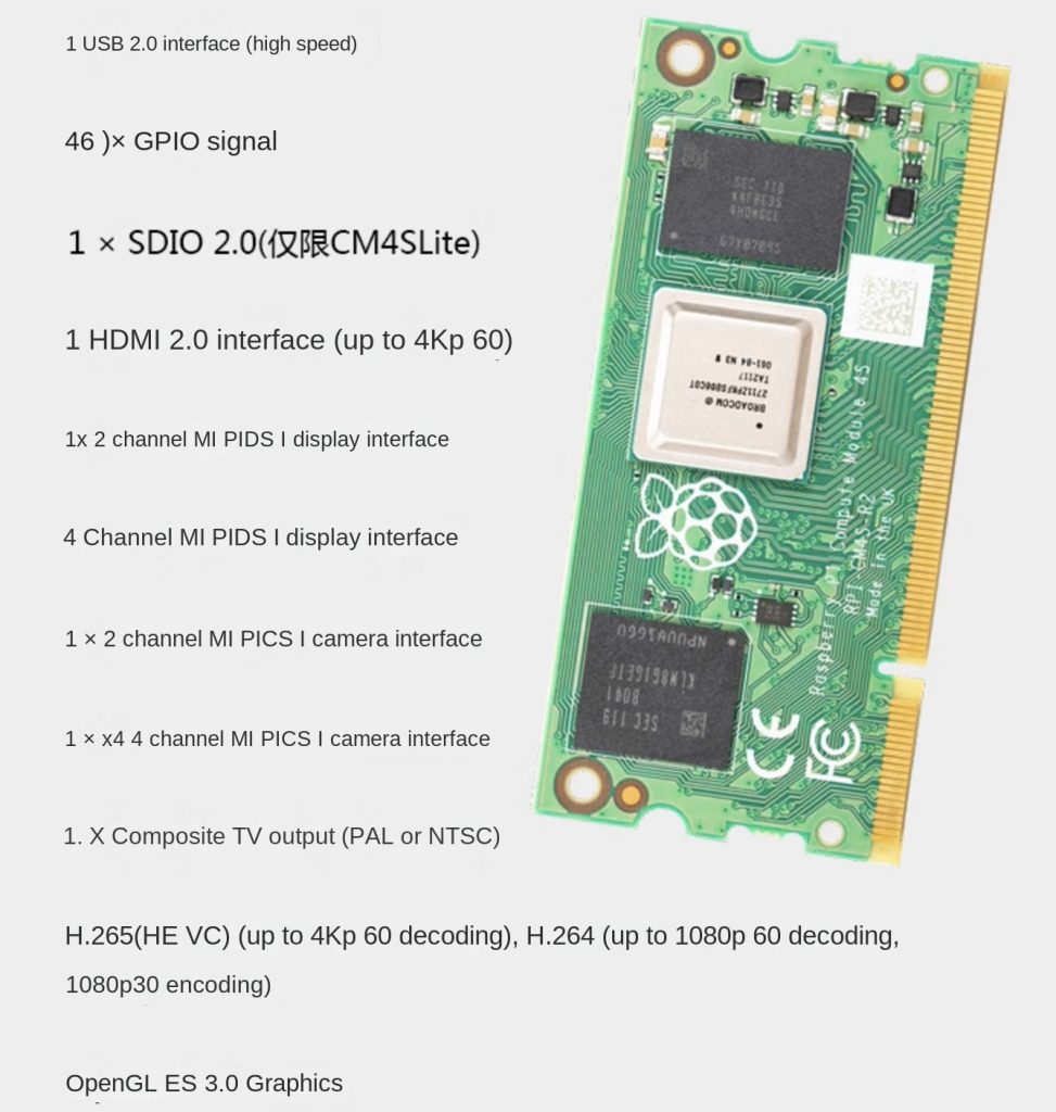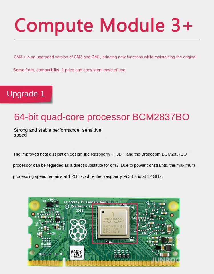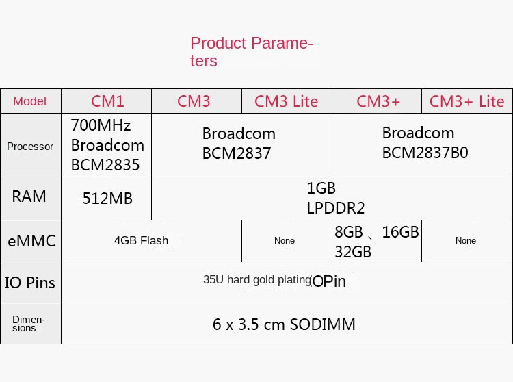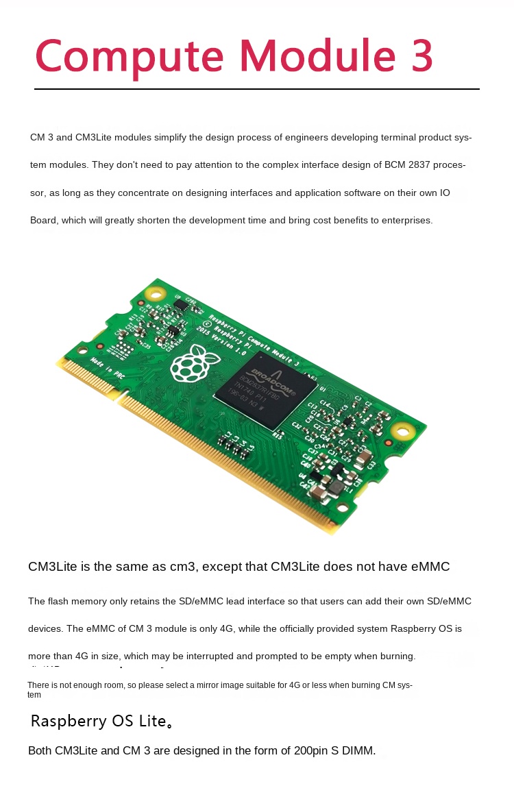 Raspberry Pi CM3 (Compute Module 3) is a high-performance computing module based on Raspberry Pi 3 hardware. Powered by a 1.2GHz Broadcom BCM2837 processor with 1GB RAM, CM3 delivers 10x CPU performance compared to the previous generation. Flexible storage options include a standard 4GB eMMC flash memory version and a Lite version with an SD expansion interface. CM3 supports Windows IoT and Linux systems, offering developers a versatile platform for embedded development, industrial automation, and IoT projects. Compact size and multiple interfaces enable easy integration with external hardware, making secondary development straightforward.