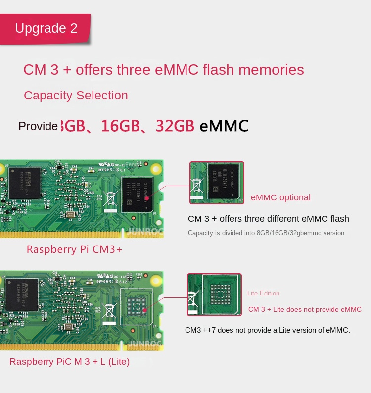 | eMMC | 4GB Flash | None | 8GB、16GB32GB | None | |