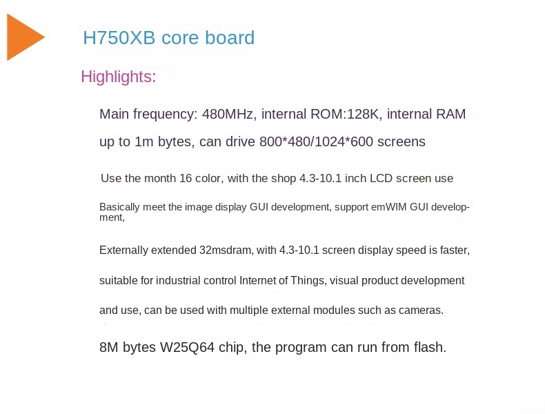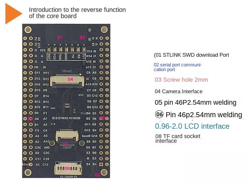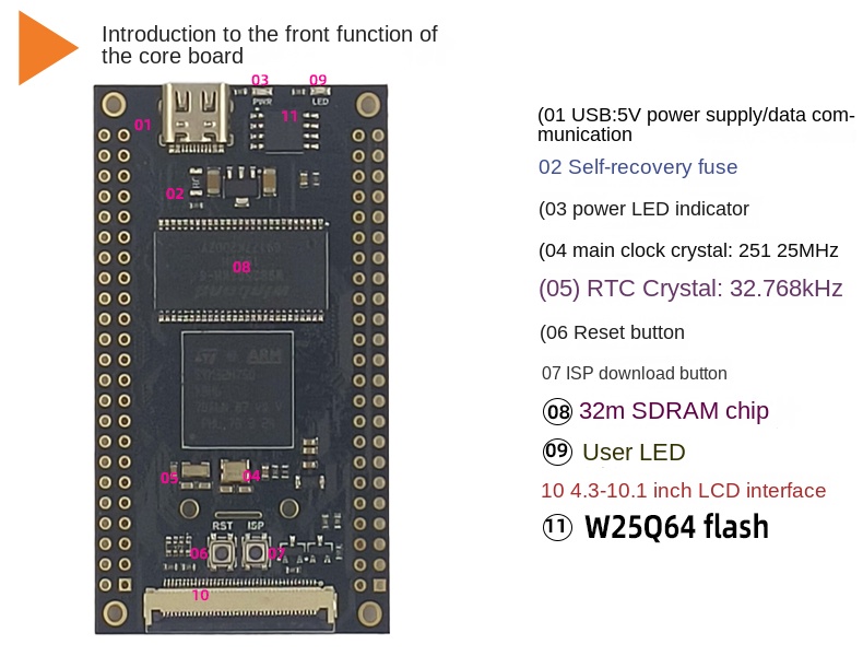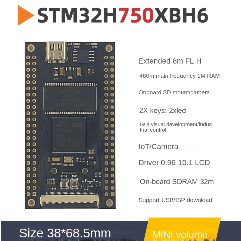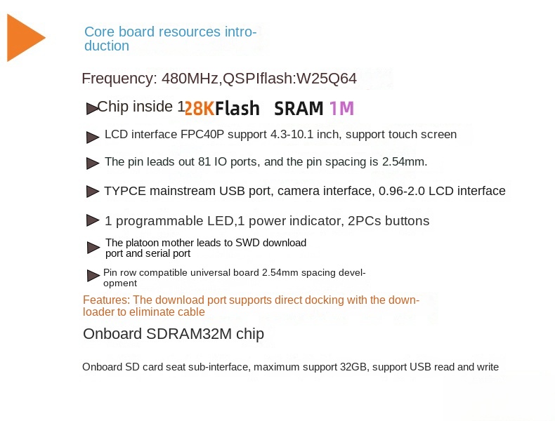 | Product Features | Extended 8m FLH480m main frequency 1M RAMOnboard SD mount/camera2X keys: 2xledGUl visual development/industrial control/CameraDriver 0.96-10.1 LCDOn-board SDRAM 32mSupport USB/SP download |