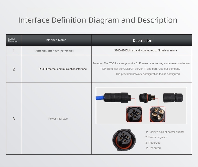 This interface definition diagram outlines three key interfaces: an N-type female antenna interface for 3700-4200MHz band connections, an RJ45 Ethernet communication interface for reporting TDOA messages to the CLE server via TCP client mode (configurable using our network tools), and a power interface with defined pins (pin 1 is positive, pin 2 is negative, and pins 3-4 are reserved).